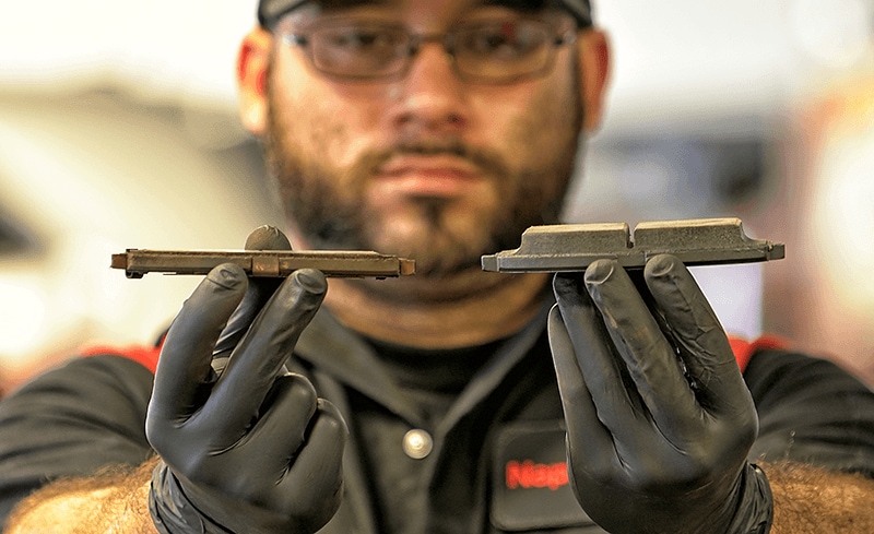 That's where the inspection comes in: Having your Northlake Chrysler Dodge Jeep Ram Service Advisor inspect your brake pads during periodic oil changes will keep you aware of how much pad material remains before you are down to the metal.