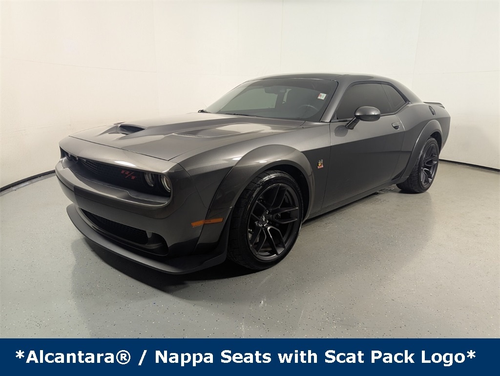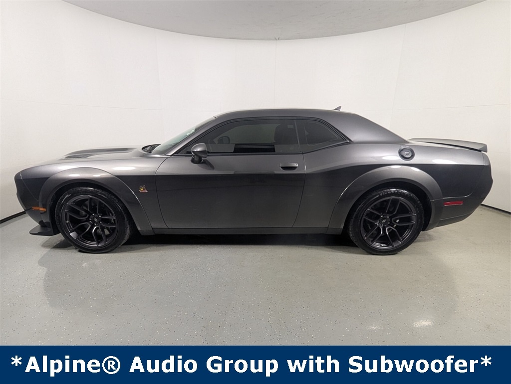 This Challenger is well equipped with Alpine Audio Group w/Subwoofer (506 Watt Amplifier and 9 Amplified Speakers w/Subwoofer), Driver Convenience Group, Plus Package, Quick Order Package 24N R/T Scat Pack Widebody (Widebody Competition Suspension, Widebody Fender Flares, 3.09 Rear Axle Ratio, and Wheels: 20" x 11.0" Devil's Rim Aluminum), 1-Yr SiriusXM Guardian Trial, 230MM Rear Axle, 4-Wheel Disc Brakes, 5-Year SiriusXM Travel Link Service, 6 Speakers, ABS brakes, Air Conditioning, Alloy wheels, AM/FM radio: SiriusXM, Anti-whiplash front head restraints, Apple CarPlay, Apple CarPlay/Android Auto, Auto-dimming Rear-View mirror, Automatic temperature control, Brake assist, Bumpers: body-color, Compass, Delay-off headlights, Driver door bin, Driver vanity mirror, Dual front impact airbags, Dual front side impact airbags, Electronic Stability Control, Emergency communication system: SiriusXM Guardian, For Details, Visit DriveUconnect.com, Four wheel independent suspension, Front anti-roll bar, Front Bucket Seats, Front Center Armrest, Front dual zone A/C, Front fog lights, Front reading lights, Fully automatic headlights, Garage door transmitter, Google Android Auto, GPS Antenna Input, GPS Navigation, Heated door mirrors, Heated front seats, Heated steering wheel, Illuminated entry, Integrated Center Stack Radio, Integrated Voice Command w/Bluetooth, Leather Shift Knob, Low tire pressure warning, Media Hub (2 USB, AUX), Outside temperature display, Overhead airbag, Overhead console, Panic alarm, ParkView Rear Back-Up Camera, Passenger door bin, Passenger vanity mirror, Power door mirrors, Power driver seat, Power steering, Power windows, Radio data system, Radio: Uconnect 4C Nav w/8.4" Display, Radio: Uconnect 4C w/8.4" Display, Rear anti-roll bar, Rear reading lights, Rear seat center armrest, Rear window defroster, Remote keyless entry, Scat Pack Logo Houndstooth Seat, Security system, Shark Fin Antenna, SiriusXM Satellite Radio, SiriusXM Travel Link, Speed control, Speed-sensing steering, Split folding rear seat, Spoiler, Sport steering wheel, Steering wheel mounted audio controls, Tachometer, Telescoping steering wheel, Tilt steering wheel, Traction control, Trip computer, USB Host Flip, Variably intermittent wipers, and Wheels: 20" x 9" Lo Gloss Granite Crystal.