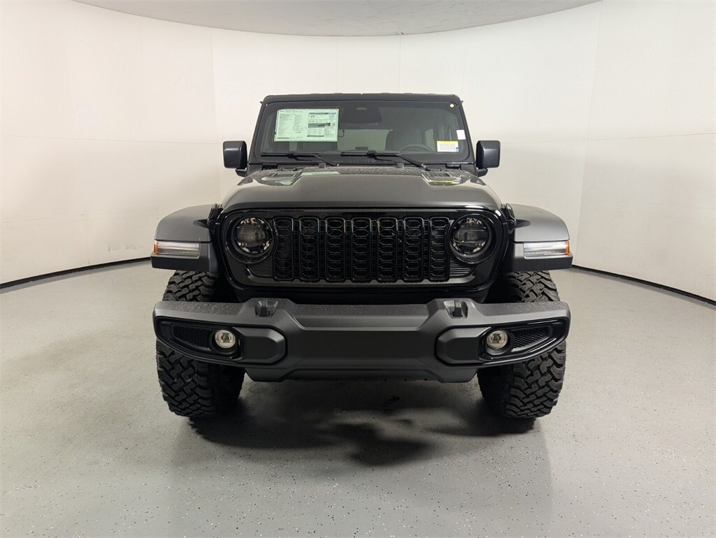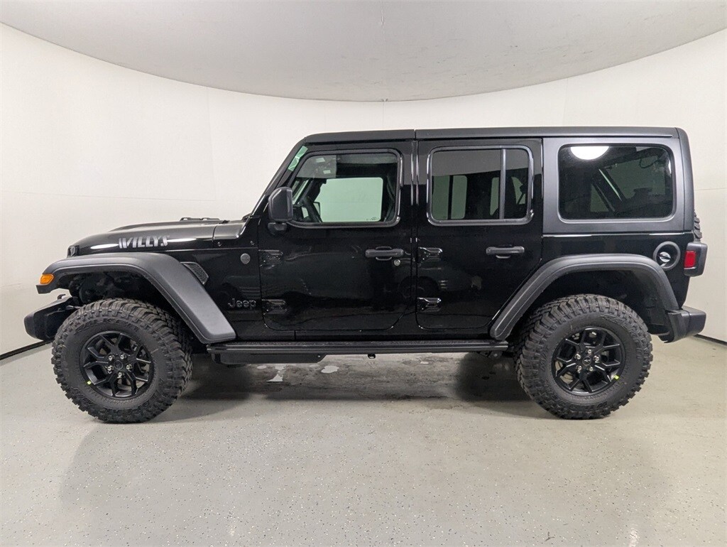 This Wrangler is well equipped with Quick Order Package 23W Willys (4-Wheel Drive Swing Gate Decal, 7 and 4 Pin Wiring Harness, Advanced Brake Assist, Automatic Headlamps, Auxiliary Switches, Class II Receiver Hitch, Conventional Differential Front Axle, Corning Gorilla Glass, Dana M210 Wide HD Tube Front Axle, Dana M220 Wide Rear Axle, Daytime Running Lamps LED Accents, Deep Tint Sunscreen Windows, E-Locker Rear Axle, Enhanced Adaptive Cruise Control, Front LED Fog Lamps, Full Speed Forward Collision Warning Plus, Injection Molded Black Rear Bumper, LED Premium Reflector Headlamps, Mold in Color Bumper with Gloss Black, Molded in Color Rubicon Highline Flare, MOPAR All-Weather Floor Mats, Off-Road Plus Mode, Power Heated Mirrors, Premium Wrapped Steering Wheel, Security Alarm, Sun Visors with Illuminated Vanity Mirrors, Wheels: 17" x 7.5" Painted Black, Willy's Suspension, and Willys Hood Decal), Quick Order Package 24W Willys, 12.3" Touchscreen Display, 4-Wheel Disc Brakes, 4G LTE Wi-Fi Hot Spot, 8 Speakers, ABS brakes, Air Conditioning, AM/FM radio: SiriusXM with 360L, Apple CarPlay, Apple CarPlay/Android Auto, Aux Battery, Black 3-Piece Hard Top, Brake assist, Cloth Low-Back Bucket Seats, Compass, Connectivity - US/Canada, Delay-off headlights, Driver door bin, Driver vanity mirror, Dual front impact airbags, Dual front side impact airbags, Electronic Stability Control, For More Info, Call 800-643-2112, Freedom Panel Storage Bag, Front anti-roll bar, Front Bucket Seats, Front Center Armrest w/Storage, Front fog lights, Front reading lights, Google Android Auto, Illuminated entry, Integrated Center Stack Radio, Integrated roll-over protection, Low tire pressure warning, Myflexcare Service Plan, Non-Lock Fuel Cap Without Discriminator, Normal Duty Suspension, Occupant sensing airbag, Outside temperature display, Overhead airbag, Panic alarm, ParkView Rear Back-Up Camera, Passenger door bin, Passenger vanity mirror, Power steering, Power windows, Radio data system, Radio: Uconnect 5 with 12.3" Display, Rear anti-roll bar, Rear reading lights, Rear Window Defroster, Rear Window Wiper/Washer, Remote keyless entry, SiriusXM Radio Service, SiriusXM with 360L, Speed control, Split folding rear seat, Steering wheel mounted audio controls, Stop-Start Dual Battery System, Tachometer, Telescoping steering wheel, Tilt steering wheel, Traction control, Trip computer, Variably intermittent wipers, and Wheels: 17" x 7.5" Black Steel Styled.