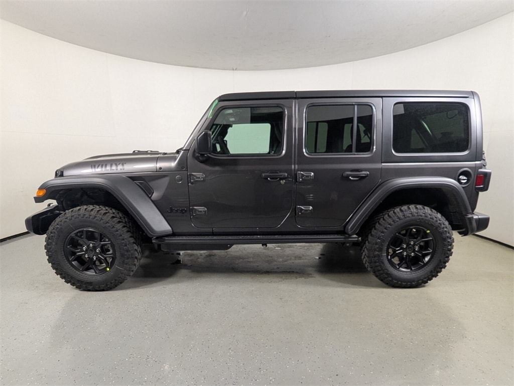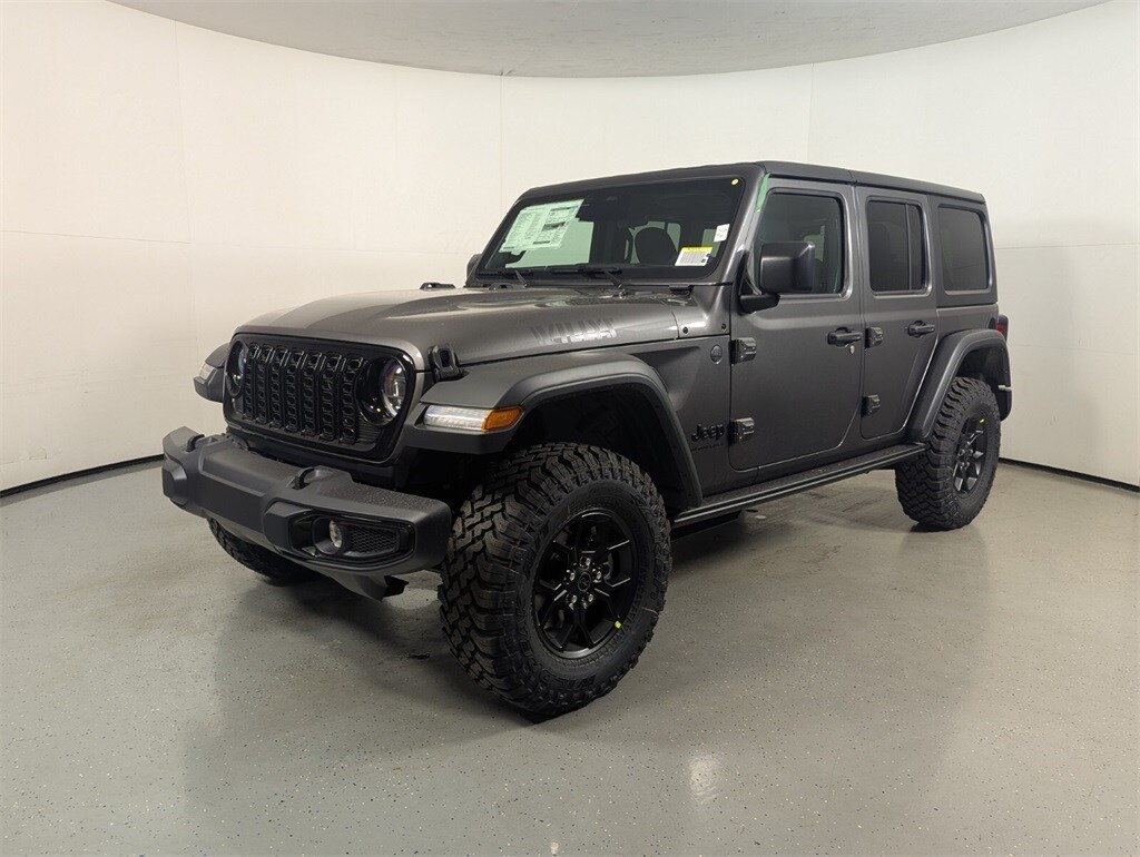 This Wrangler is well equipped with Quick Order Package 23W Willys (4-Wheel Drive Swing Gate Decal, 7 and 4 Pin Wiring Harness, Advanced Brake Assist, Automatic Headlamps, Auxiliary Switches, Class II Receiver Hitch, Conventional Differential Front Axle, Corning Gorilla Glass, Dana M210 Wide HD Tube Front Axle, Dana M220 Wide Rear Axle, Daytime Running Lamps LED Accents, Deep Tint Sunscreen Windows, E-Locker Rear Axle, Enhanced Adaptive Cruise Control, Front LED Fog Lamps, Full Speed Forward Collision Warning Plus, Injection Molded Black Rear Bumper, LED Premium Reflector Headlamps, Mold in Color Bumper with Gloss Black, Molded in Color Rubicon Highline Flare, MOPAR All-Weather Floor Mats, Off-Road Plus Mode, Power Heated Mirrors, Premium Wrapped Steering Wheel, Security Alarm, Sun Visors with Illuminated Vanity Mirrors, Wheels: 17" x 7.5" Painted Black, Willy's Suspension, and Willys Hood Decal), Quick Order Package 24W Willys, 12.3" Touchscreen Display, 4-Wheel Disc Brakes, 4G LTE Wi-Fi Hot Spot, 8 Speakers, ABS brakes, Air Conditioning, AM/FM radio: SiriusXM with 360L, Apple CarPlay, Apple CarPlay/Android Auto, Aux Battery, Black 3-Piece Hard Top, Brake assist, Cloth Low-Back Bucket Seats, Compass, Connectivity - US/Canada, Delay-off headlights, Driver door bin, Driver vanity mirror, Dual front impact airbags, Dual front side impact airbags, Electronic Stability Control, For More Info, Call 800-643-2112, Freedom Panel Storage Bag, Front anti-roll bar, Front Bucket Seats, Front Center Armrest w/Storage, Front fog lights, Front reading lights, Google Android Auto, Illuminated entry, Integrated Center Stack Radio, Integrated roll-over protection, Low tire pressure warning, Myflexcare Service Plan, Non-Lock Fuel Cap Without Discriminator, Normal Duty Suspension, Occupant sensing airbag, Outside temperature display, Overhead airbag, Panic alarm, ParkView Rear Back-Up Camera, Passenger door bin, Passenger vanity mirror, Power steering, Power windows, Radio data system, Radio: Uconnect 5 with 12.3" Display, Rear anti-roll bar, Rear reading lights, Rear Window Defroster, Rear Window Wiper/Washer, Remote keyless entry, SiriusXM Radio Service, SiriusXM with 360L, Speed control, Split folding rear seat, Steering wheel mounted audio controls, Stop-Start Dual Battery System, Tachometer, Telescoping steering wheel, Tilt steering wheel, Traction control, Trip computer, Variably intermittent wipers, and Wheels: 17" x 7.5" Black Steel Styled.