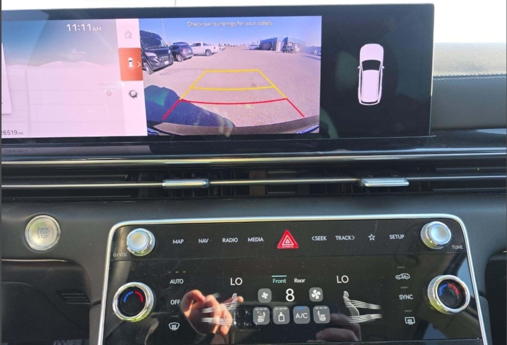 Features: 12 Speakers, 4-Wheel Disc Brakes, ABS brakes, Air Conditioning, Alloy wheels, AM/FM radio: SiriusXM, Anti-whiplash front head restraints, Auto High-beam Headlights, Auto tilt-away steering wheel, Auto-dimming door mirrors, Auto-dimming Rear-View mirror, Auto-leveling suspension, Automatic temperature control, Brake assist, Bumpers: body-color, Compass, Delay-off headlights, Driver door bin, Driver vanity mirror, Dual front impact airbags, Dual front side impact airbags, Electronic Stability Control, Emergency communication system: Genesis Connected Services, Exterior Parking Camera Rear, Four wheel independent suspension, Front anti-roll bar, Front Bucket Seats, Front Center Armrest, Front dual zone A/C, Front reading lights, Fully automatic headlights, Garage door transmitter: HomeLink, Heated door mirrors, Heated Front Bucket Seats, Heated front seats, Illuminated entry, Knee airbag, Leather steering wheel, Leatherette Seating Surfaces, Low tire pressure warning, Memory seat, Navigation System, Occupant sensing airbag, Outside temperature display, Overhead airbag, Overhead console, Panic alarm, Passenger door bin, Passenger vanity mirror, Power door mirrors, Power driver seat, Power Liftgate, Power passenger seat, Power steering, Power windows, Radio data system, Radio: AM/FM/SiriusXM/HD, Rain sensing wipers, Rear air conditioning, Rear anti-roll bar, Rear reading lights, Rear seat center armrest, Rear side impact airbag, Rear window defroster, Rear window wiper, Remote keyless entry, Security system, Speed control, Speed-sensing steering, Speed-Sensitive Wipers, Split folding rear seat, Spoiler, Steering wheel memory, Steering wheel mounted audio controls, Tachometer, Telescoping steering wheel, Tilt steering wheel, Traction control, Trip computer, Turn signal indicator mirrors, Variably intermittent wipers, and Wheels: 19" x 8.5J Medium Metallic Gray Alloy.